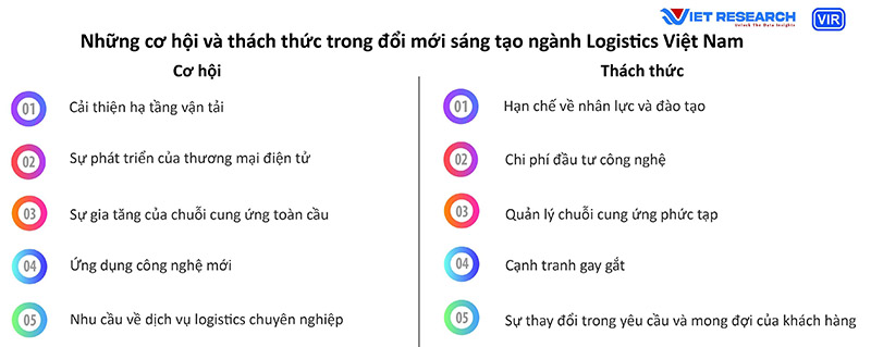 Thứ nhất, cải thiện hạ tầng vận tải: Chính phủ Việt Nam đã cam kết đầu tư mạnh mẽ vào hạ tầng vận tải, bao gồm cả cơ sở hạ tầng đường bộ, đường sắt và cảng biển. Điều này tạo ra cơ hội để áp dụng công nghệ tiên tiến và quy trình đổi mới sáng tạo trong quản lý và vận hành hệ thống logistics.